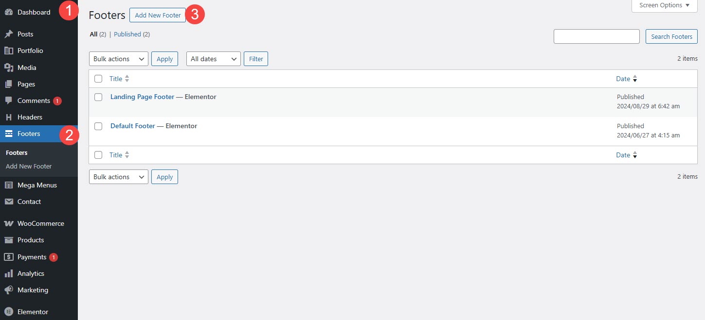 • Step 1: Go to WordPress Dashboard → Navigate to FootersSelect the footer