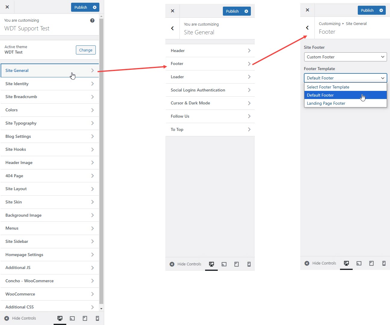 • Navigate to AppearanceCustomizeSite GeneralFooter.