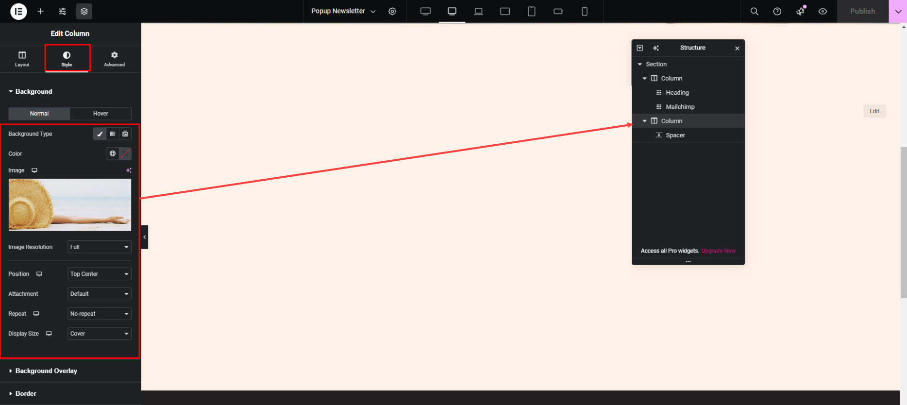 **Templates > Saved Templates > Newsletter Popup template > Edit with Elementor**, then click on the **Column** containing the image, go to the **Style** tab, and update the **Background** image as needed.