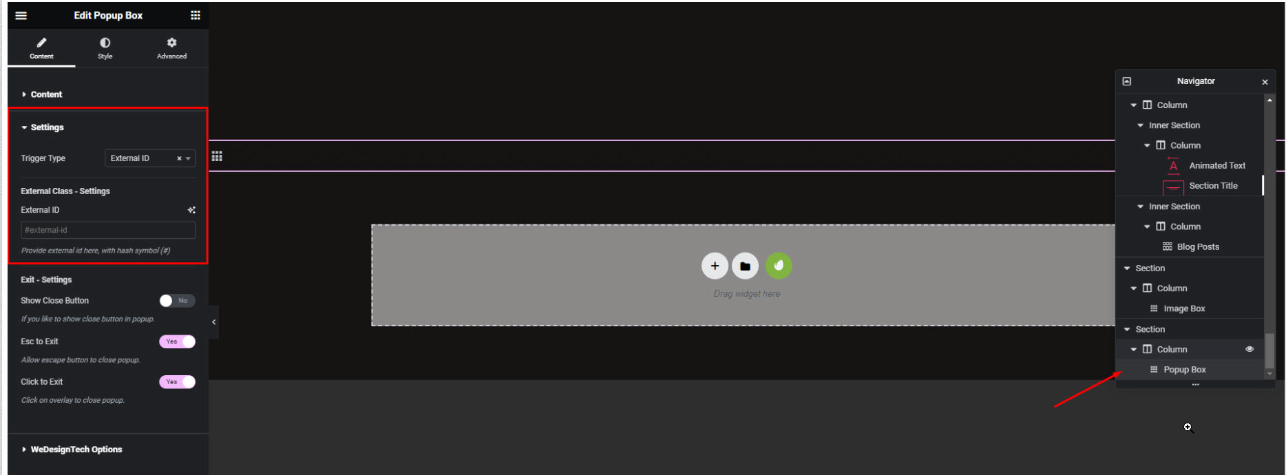 Navigate to **WordPress Dashboard > Pages > Select Homepage > Edit with Elementor**, then open the **Navigator > Popup Box > Settings**. Under **Trigger Type**, select **External Class/ID**, and **leave the text field empty.**