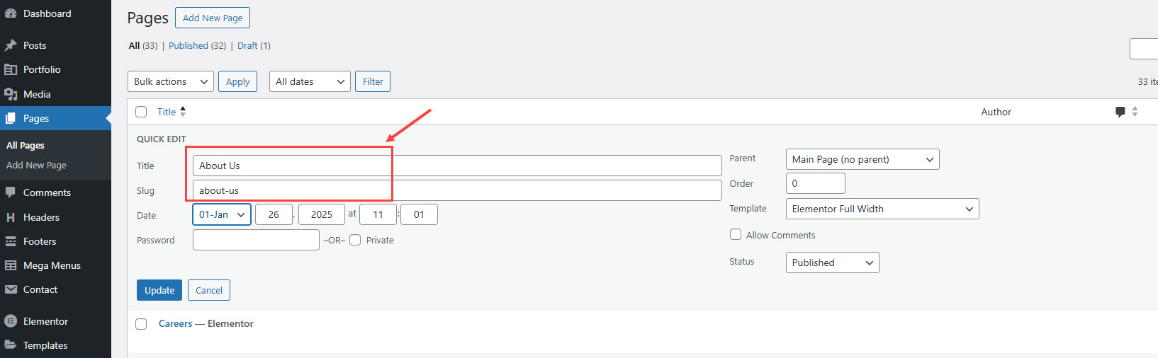 You can also edit some other options such as parent, template, status... If you want to edit more options, hit Edit instead of Quick Edit.
