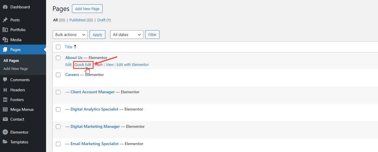 Step 1: Go to Pages > All Pages. Then point at the page you want to edit. You will see the Quick Edit option.