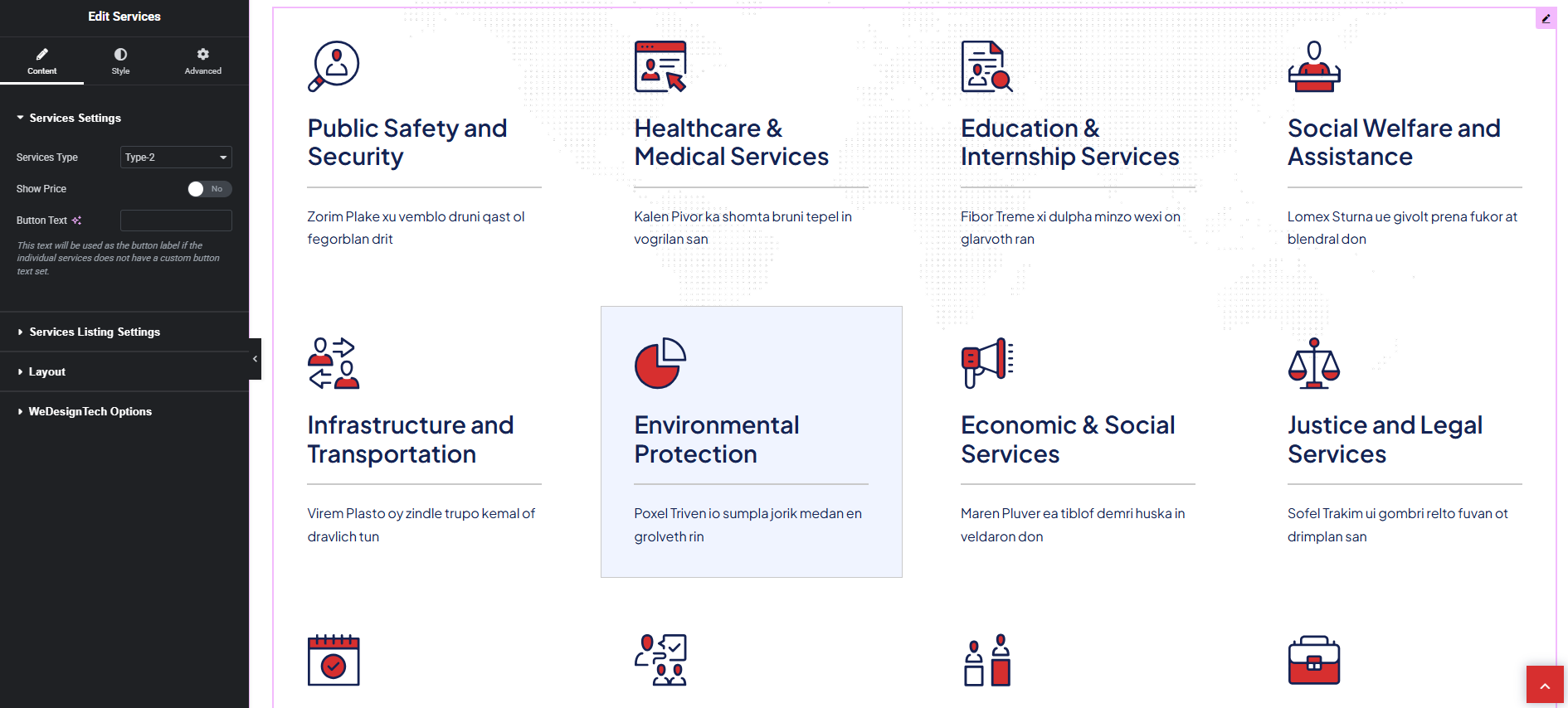 <table><thead><tr><th width="210.6666259765625">Field</th><th>Description</th></tr></thead><tbody><tr><td><strong>Service Type</strong></td><td>Choose the style or layout type for the service (e.g., Type 1, Type 2 and etc ).</td></tr><tr><td><strong>Show Price</strong></td><td>Enable or disable price visibility in the layout.</td></tr><tr><td><strong>Button Text</strong></td><td>Customize the CTA button text (e.g., “Book Now”, “Learn More”).</td></tr></tbody></table>