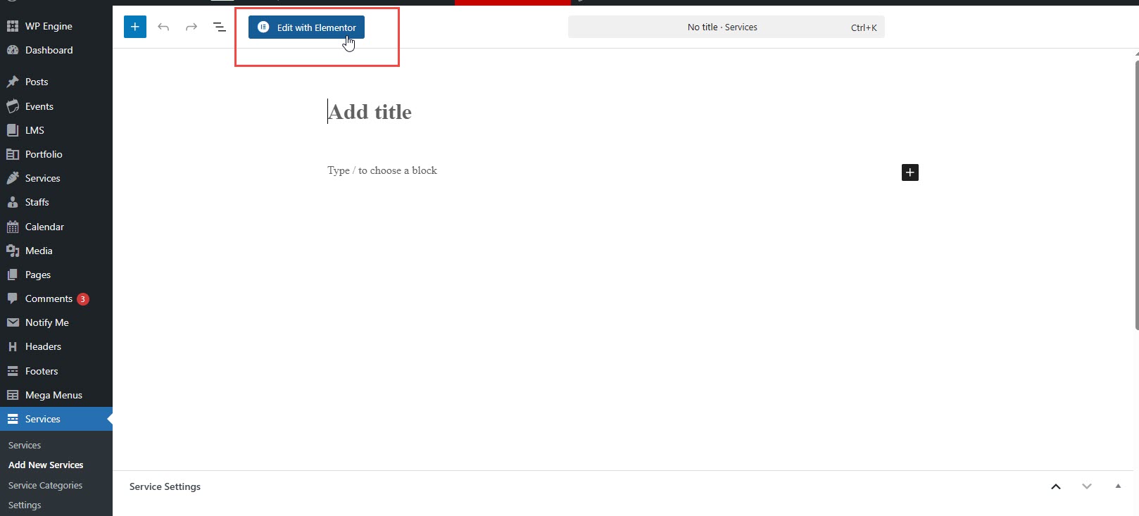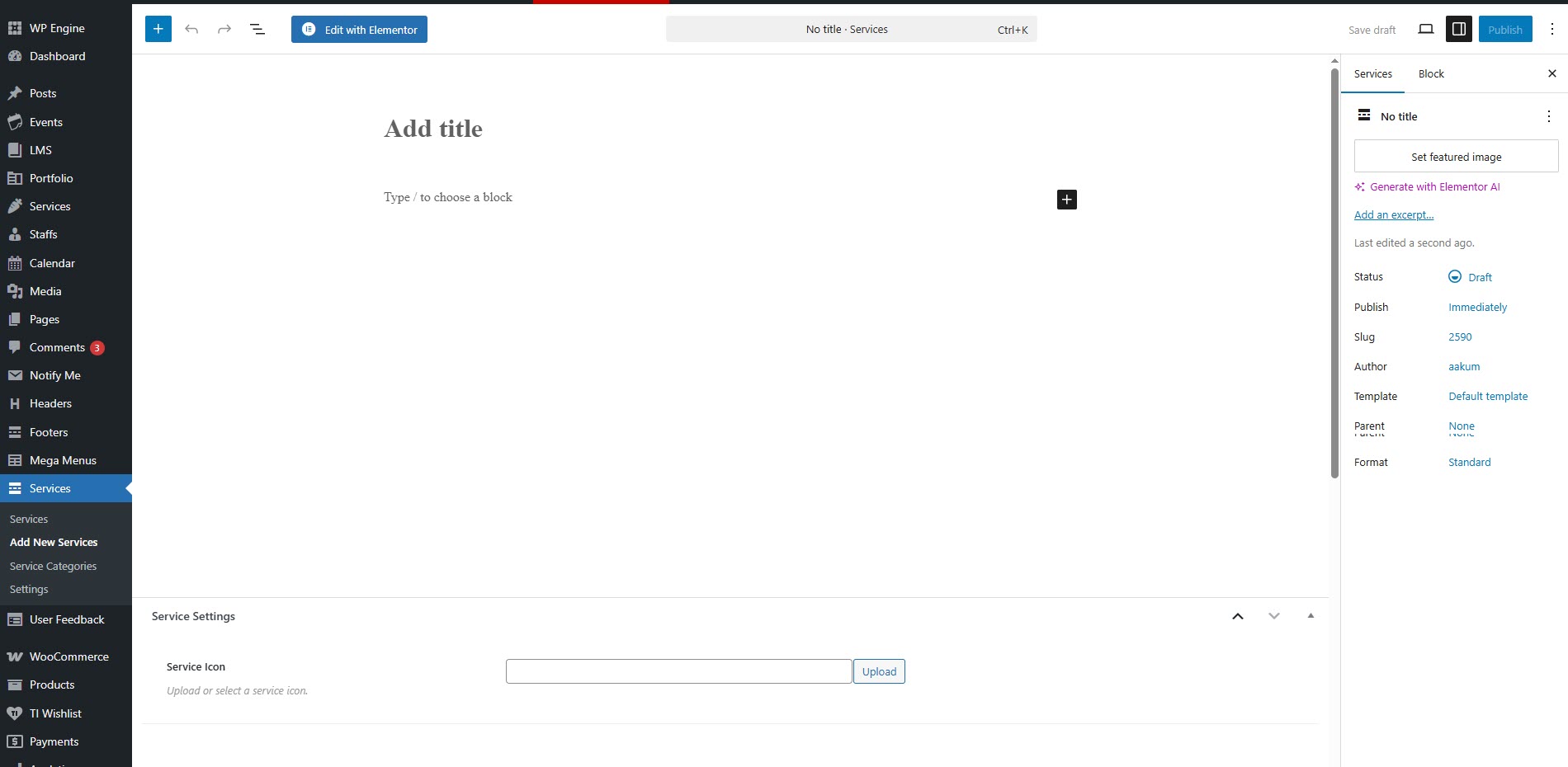 While using Elementor, you may find a custom “Add Service” widget provided by the theme. This widget allows dynamic display of services.
