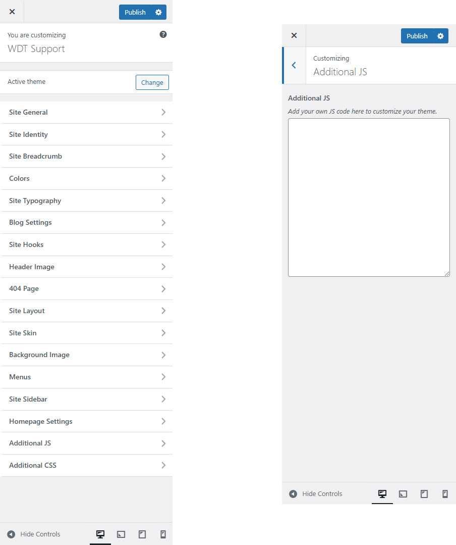 Additional JS section in the Customizer allows you to add custom JavaScript code directly to your site without editing theme files.